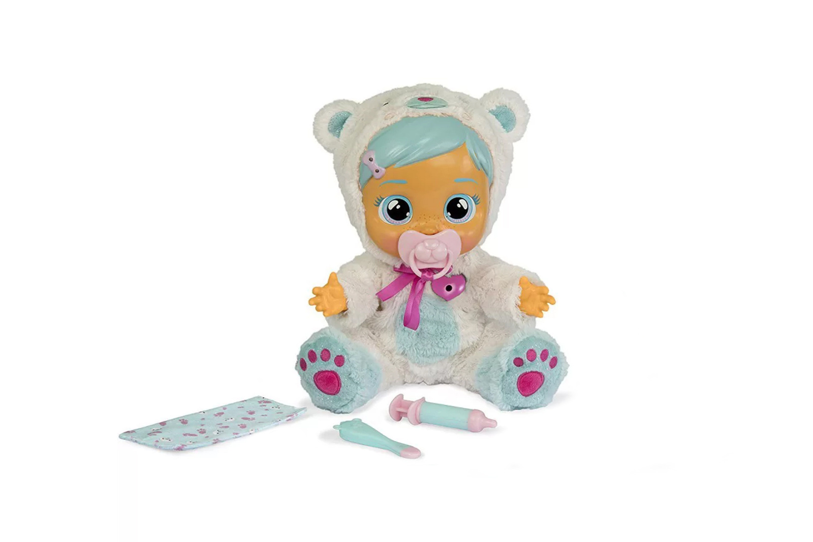 - Interaktives Zubehör, einschließlich: Schnuller, Spritze, Stofftaschentuch, Thermometer