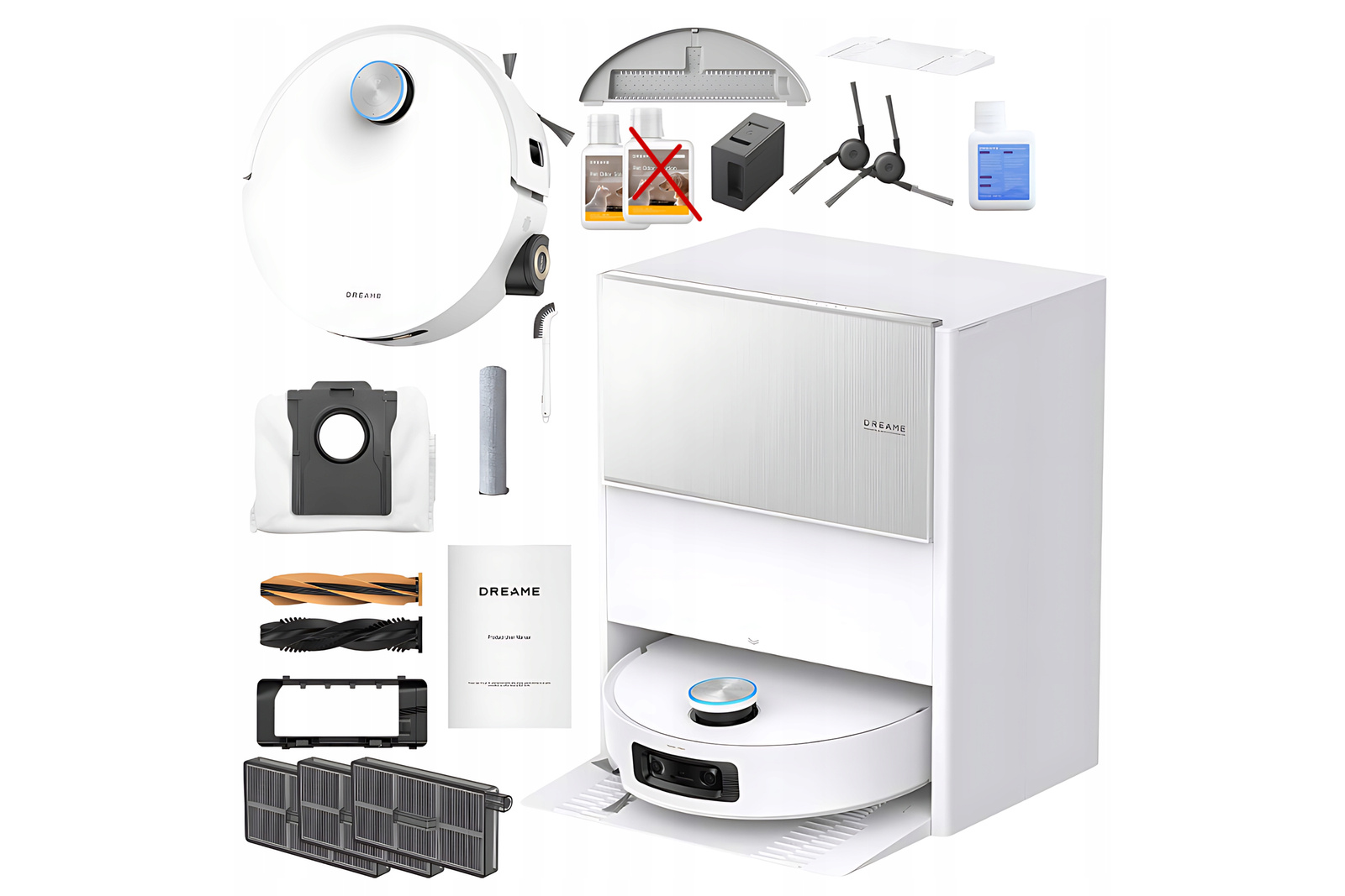The PowerDock station offers hands-free maintenance, washing the mop roller with 100°C hot water. To keep you cleaning for longer, the device comes with an extensive accessory pack. The set includes: 3x dust bags, 3x filters, 1x extra cleaning roller, 2x side brushes, 1x floor cleaning solution, and 1x pet odor remover solution.