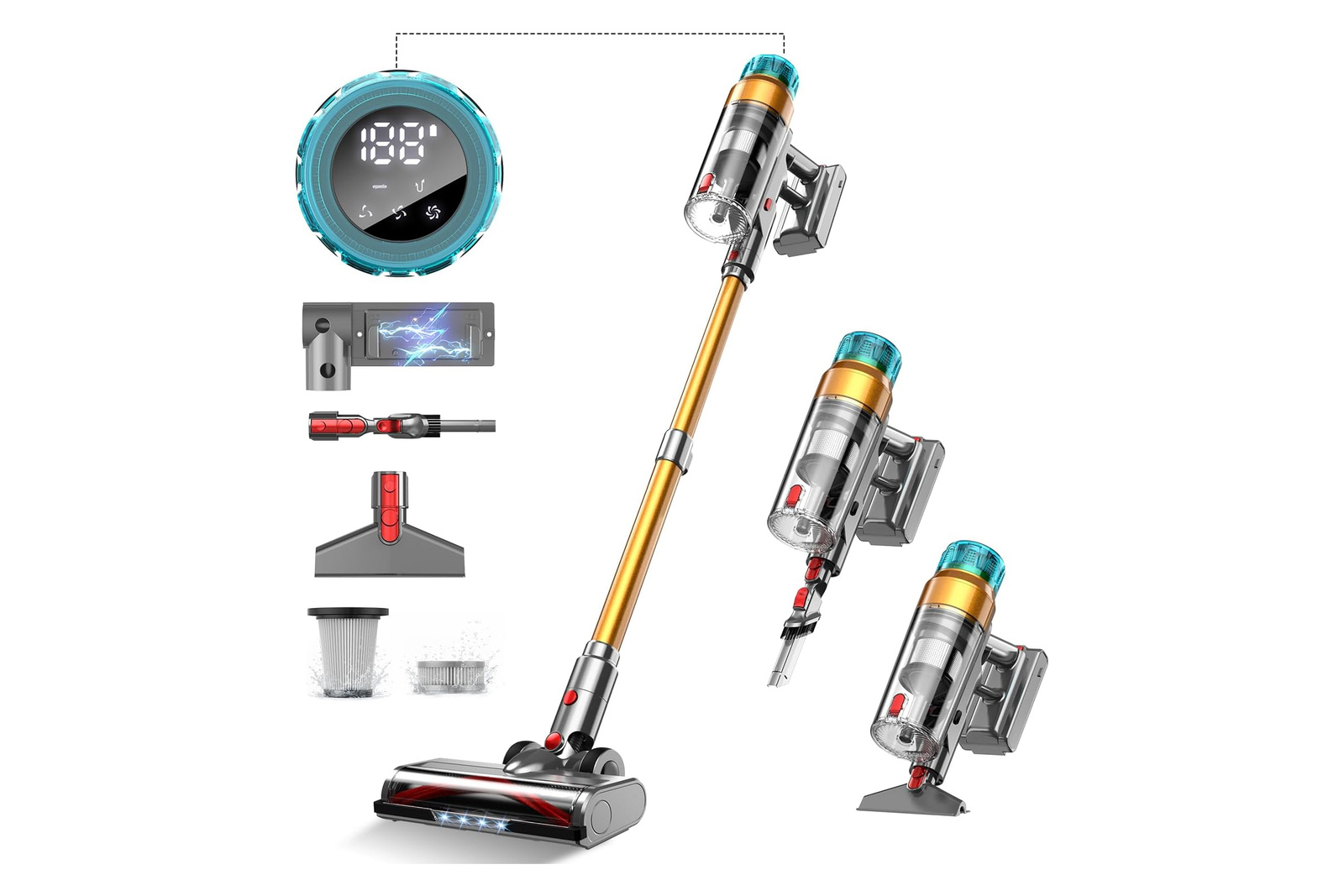 Urządzenie wyposażono w wydajny, wyjmowany akumulator (7x2500mAh), który zapewnia aż do 70 minut nieprzerwanej pracy, co pozwala na posprzątanie całego domu na jednym ładowaniu. Innowacyjny uchwyt ścienny pełni jednocześnie funkcję stacji ładowania i organizera na akcesoria. Czytelny, kolorowy wyświetlacz OLED informuje o stanie baterii, trybie pracy oraz ewentualnych blokadach, a gigantyczny zbiornik na kurz o pojemności 1,6 litra ogranicza konieczność częstego opróżniania.
